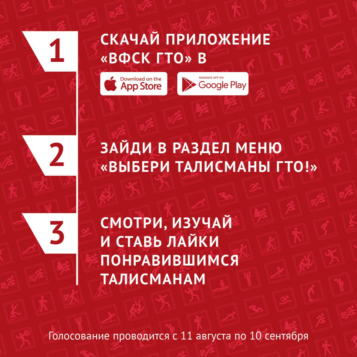 Всероссийское голосование за дизайн-проекты Талисманов ГТО начнется 11 августа в День физкультурника и продлится до 10 сентября 2018 года. Отдать голоса за понравившиеся Талисманы ГТО можно в мобильном приложении «ВФСК ГТО», скачанном в AppStore или Google Play.